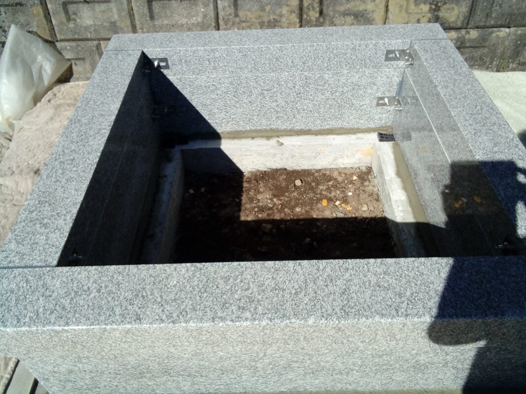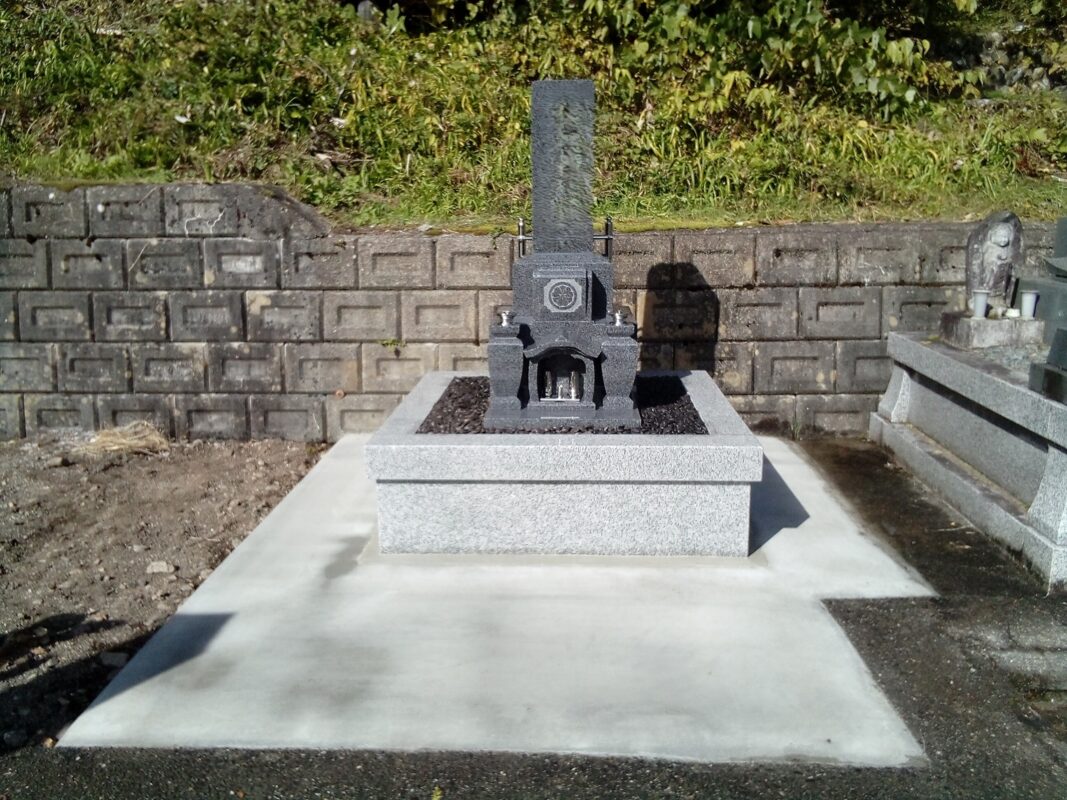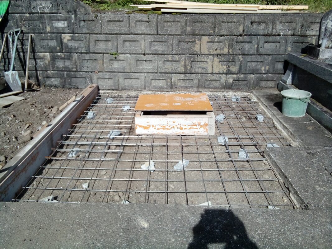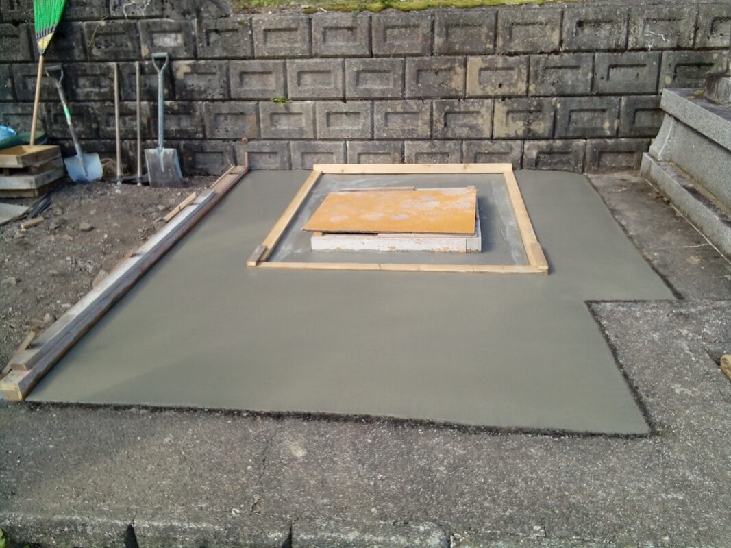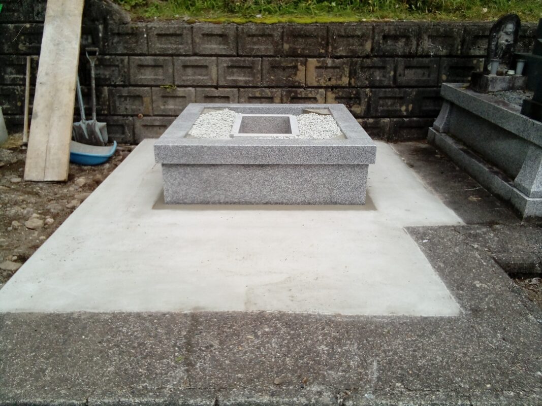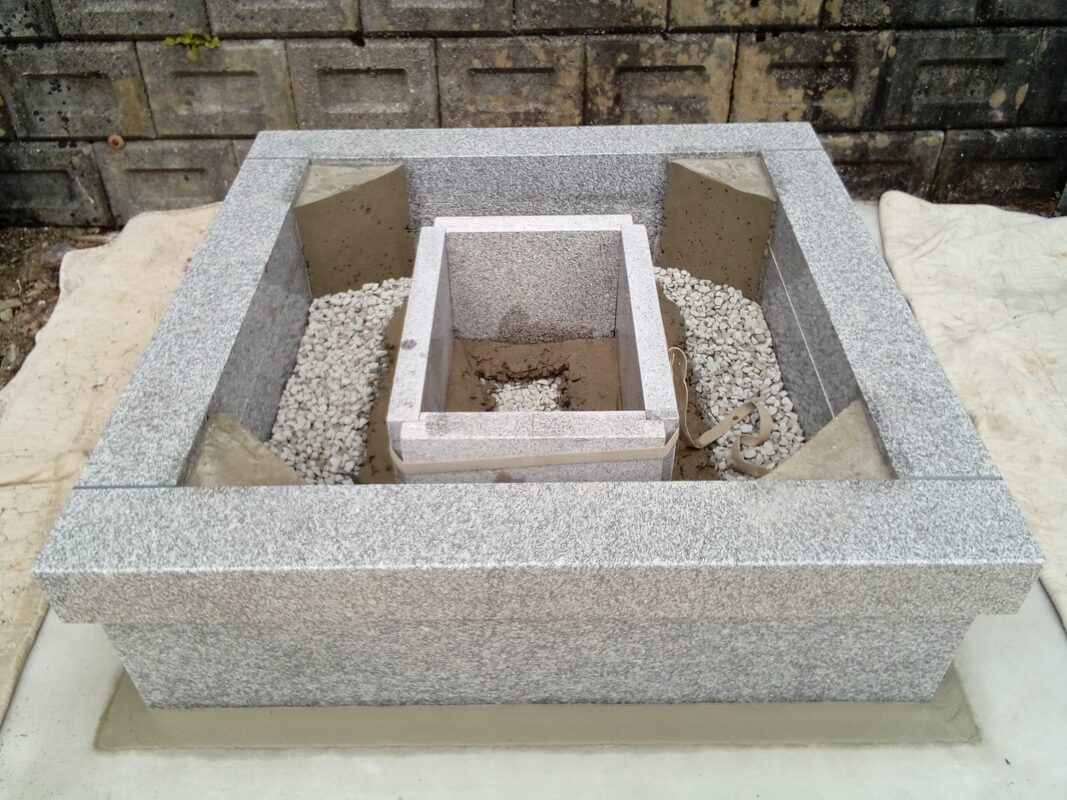 金具で固定した箇所をしっかりコンクリートで覆って御影石の納骨所も設置しました。